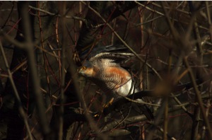 Egész héten verőfényes napsütésben dolgoztam – a négy fal között. Szombat reggel, mivel két órára nem lett volna érdemes kimennem a homoktövis élőhelykezelésre, a lest választottam. Zoli és Imre remekül sikerült ökörszem fotója inspirált, szerettem volna én is lencsevégre kapni kis kedvencemet. 8 óra után értem fel, nagy mozgás fogadott, a szokásos három cinegefaj közel harminc egyede sürgött-forgott az etető körül. Távolról egy tojó fenyőpinty is mutatkozott, de ökörszem sehol. 10 óra körül, már éppen szedelőzködtem, mikor riasztásra lettem figyelmes, balról egy karvaly húzott át, és legnagyobb örömömre beült egy közeli cseresznyefa ágára. Sajnos elég messze és takarásban is volt, de azért szorgosan kattintgattam az ágak közt kukucskálva. A cinegék persze lármáztak folyamatosan hím karvalyra. Aztán egyszer csak elrúgta magát, gondoltam – ennyi volt …